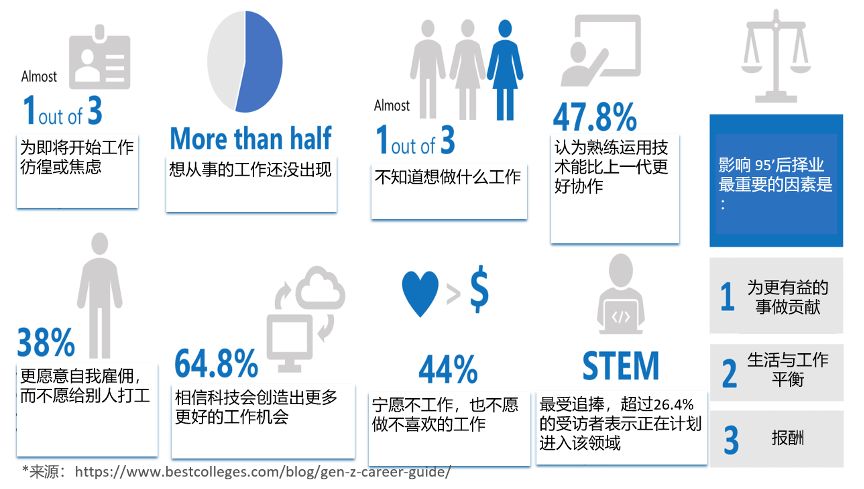 这个时代,年轻人已经不愿意加班做无意义的工作,他们需要使命感、人生意义。根据统计数据显示,影响95后择业的前三大因素中,薪酬位于最后。前两位分别是“为更有意义的事做贡献”和“生活与工作平衡”。