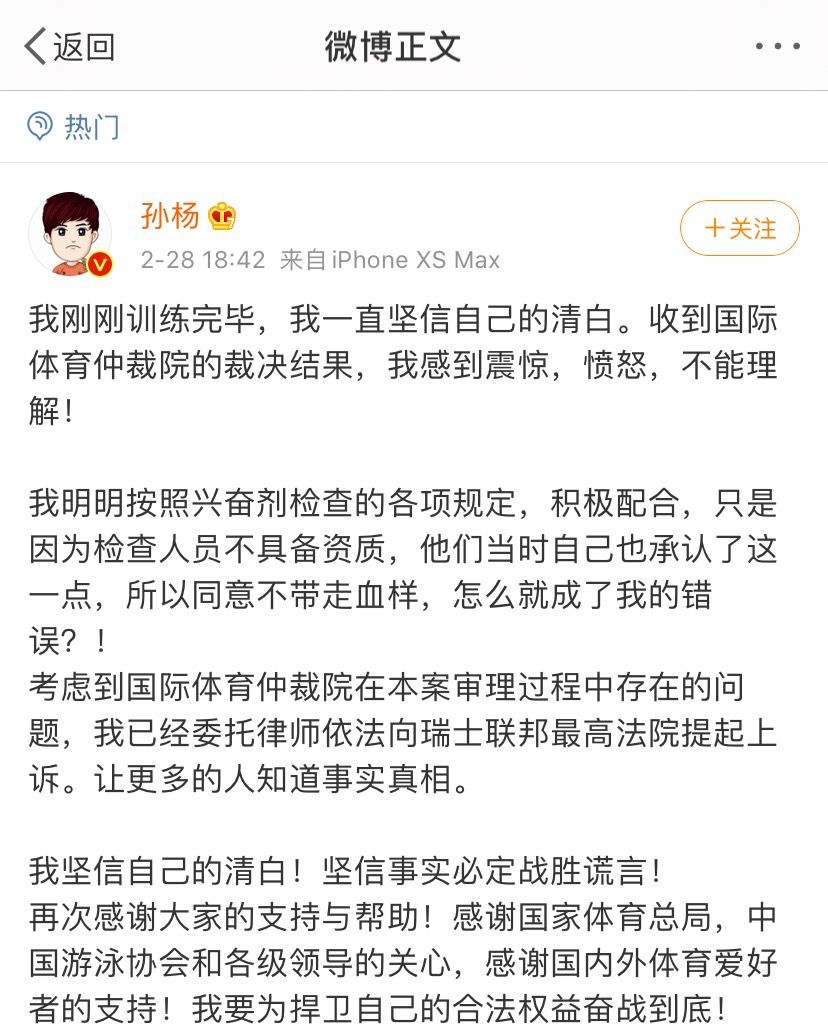 2020年2月28日,国际体育仲裁法庭(CAS)宣布了此前世界反兴奋剂机构(WADA)起诉中国游泳运动员孙杨和国际泳联(FINA)一案的仲裁结果:2月28日开始,孙杨被禁赛8年。尽管孙杨仍拥有向瑞士联邦最高法院上诉的机会,但翻案机会渺茫。