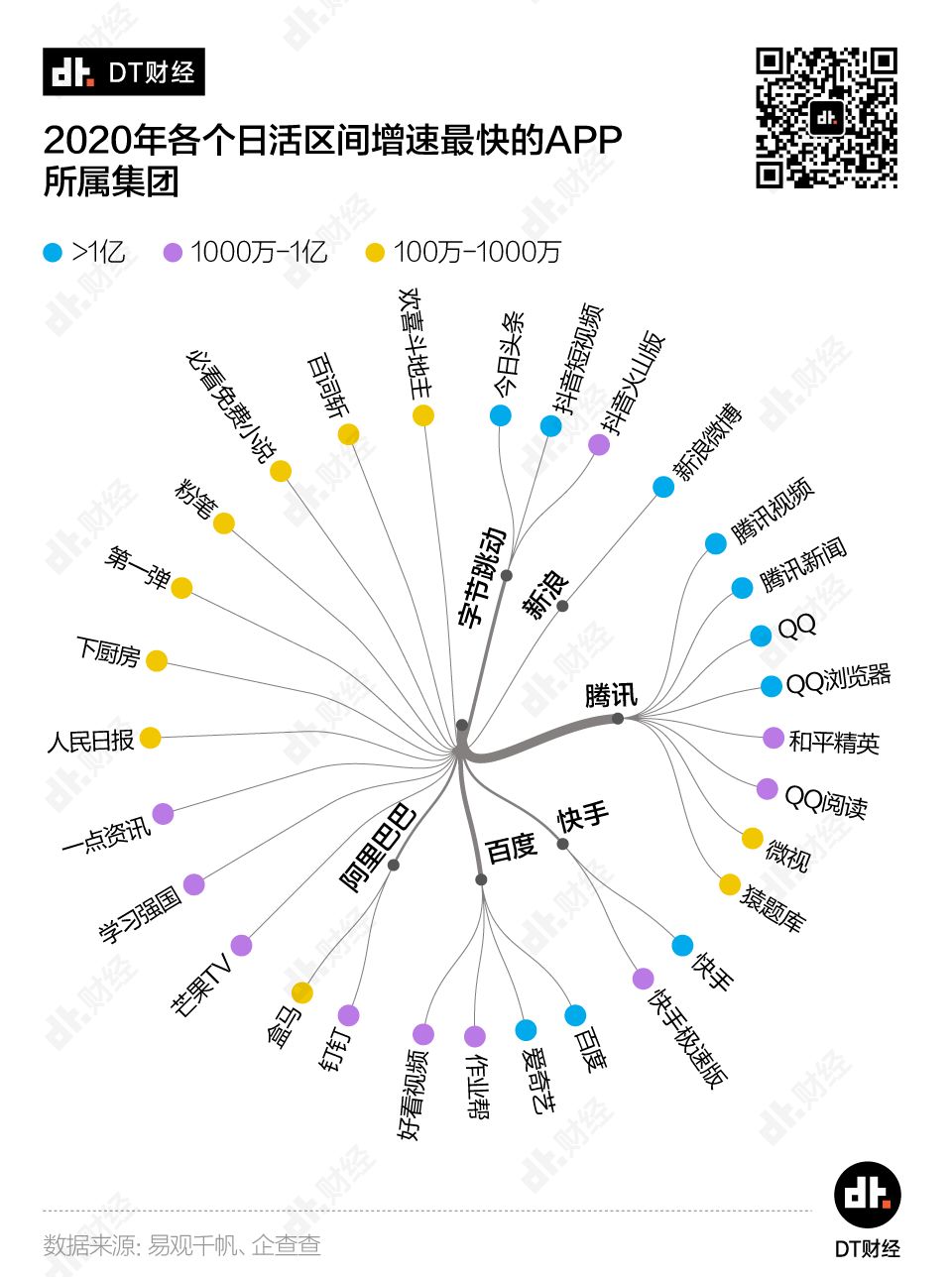 在上文提到春节表现颇为出色的APP中,我们不难发现,除了人民日报、芒果TV等少数几个平台,在各个日活段位中,增长最快的APP均来自阿里巴巴、腾讯、百度、字节跳动、新浪、快手等互联网大厂。