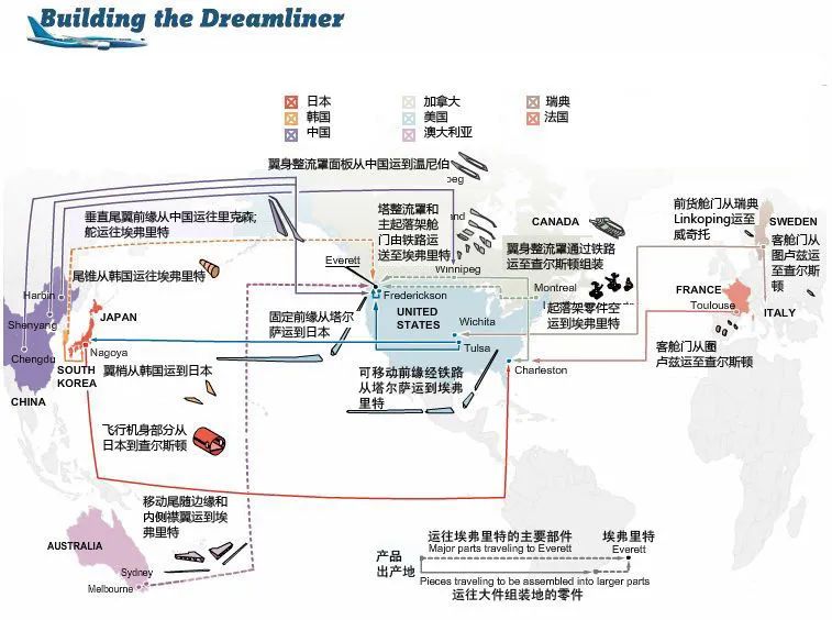 或许是因为被称为Dreamliner(梦想客机),波音公司在787上进行了许多天马行空的尝试,例如设计上提出「发动机互换」的概念,材料上大比例替换复合材料。在供应链管理上,波音公司也进行了一场豪赌——按照「风险共担、利益共享」的模式推进项目,不仅让供应商为其生产制造零部件,甚至大胆放手,让供应商参与设计工作,将项目风险和责任转移到50余家一级供应商。