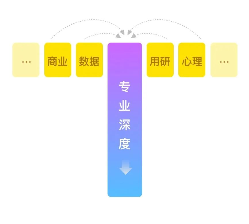 因而,我觉得这个T型结构中的横向能力其实是一种思维开阔、兴趣、爱好等,是指设计师在商业策略、用户研究、需求、行为等各方面的知识都尽可能知道得多一些。