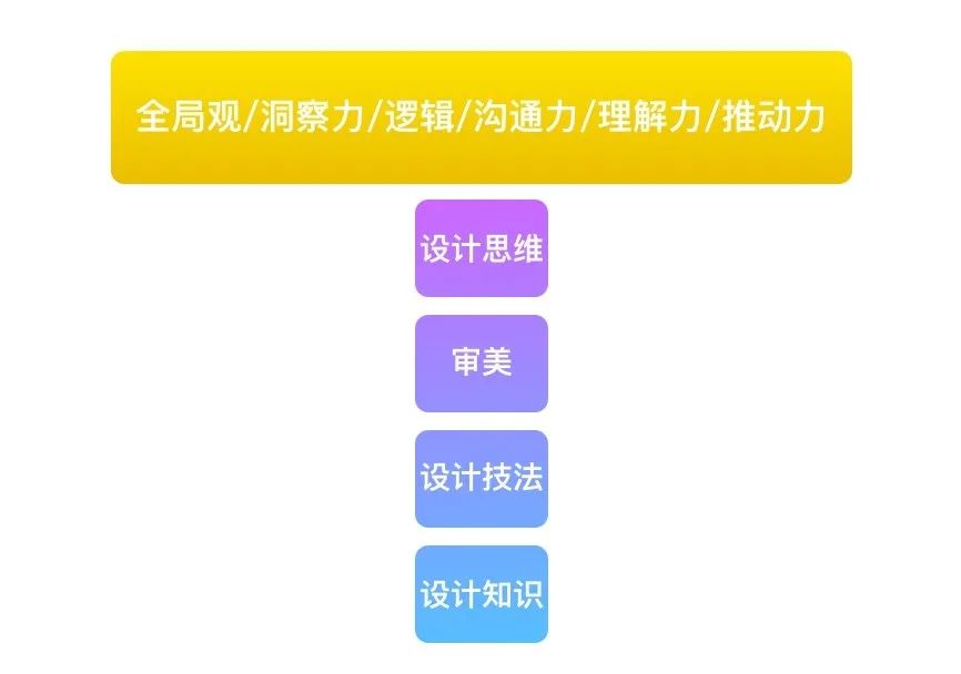纵向深度:设计思维、设计技法、审美能力、设计知识储备等几大模块。每个模块下面可以继续拆分。