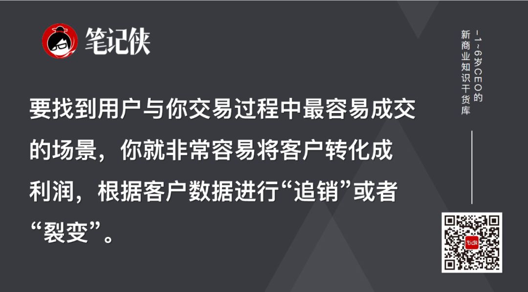 要找到用户与你交易过程中最容易成交的场景,你就非常容易将客户转化成利润,根据客户数据进行“追销”或者“裂变”。