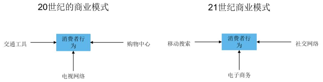 移动搜索解决了消费者对信息的主动性抓取,随时随地获得以前无法获取并比较的资源; 社交网络实现了消费者对于商品和服务的评价,消费者不再依赖原有的电视广告,更多从口碑效应、社区效应,从连接的群体中获得信息; 电子商务实现人们可以在线上比价、看评论、购买,这三种力量的叠加重构了新的模式。