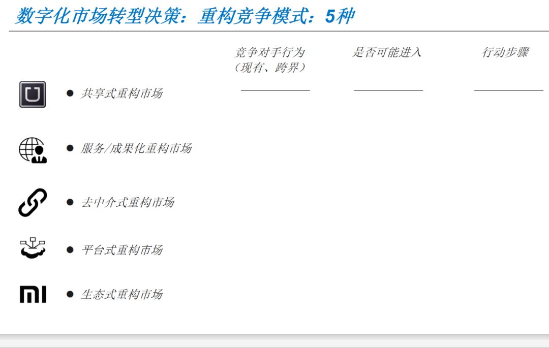 共享式重构市场、产品/服务成果化重构市场、去中介化重构市场、平台式重构市场和生态式重构市场,这些模式提到很多,这里不展开赘述。