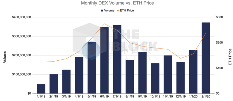 以太坊分析网站Dune Analytics的数据显示,2020年2月,基于以太坊的去中心化交易所的交易量超过3.72亿美元,较上月增长62%,创单月交易量历史新高。2月交易量超过2019年7月3.58亿美元的历史最高水平。据此前报道,2019年,基于以太坊的的去中心化交易所交易量超过23亿美元。(The Block)