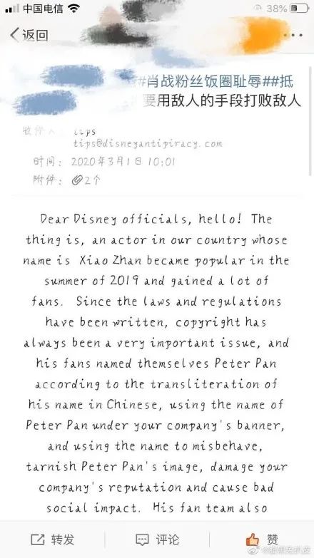 更有网友直接有网友发邮件给迪士尼,举报肖战粉丝名“小飞侠”涉嫌侵权,并号召大家搜集肖战团队使用“小飞侠”从事商业活动的证据。3月1日下午,有微博网友发文称已经收到了迪士尼的回复,要求其提供证据。随后,该网友呼吁更多网友给迪士尼写邮件举报并提供相关证据。