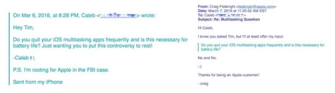 iPhone 也是类似的情况。关于要不要清理后台的讨论几年前就有,国外还有网友发邮件问过库克,虽然库克本人没有回答,但得到了苹果软件工程负责人 Craig Federighi 的回应:「不要。」iOS 应用在后台时处于暂停状态,会释放内存给其它应用,而如果你将它强制退出,那么重新启动需要耗费的 CPU 能力和电池能量,要比从暂停状态下直接唤醒更多,从而影响 iPhone 电池寿命。
