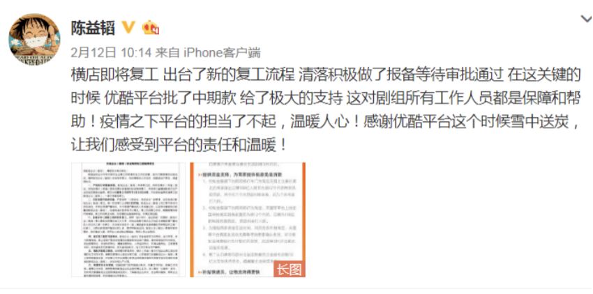 剧组遇到的实属“无解题”,所有人只能等待。好消息是,横店影视城已经于2月13日开始逐步复工,分阶段稳步推进实施。而如贵州等疫情较轻的其他地区,一些剧组也已投入到加班赶进度的节奏。而陈益韬也发微博表示,《清落》正在积极报备等待复工审批通过,还提前拿到了优酷平台的中期款,实属雪中送炭。