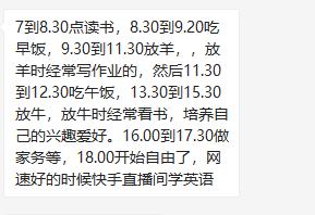 《深网》从娘巴给的每日计划中看出,除晨读外,娘巴大部分看书、写作业时间都是和放牛、放羊的时间吻合。“放牛放羊时,我都会带着书本和作业,等把牛羊赶到牧场,不需要人一直盯着时,我就会在旁边写作业,看着牛羊走远了,我再带着书追上,得空的时候就背背课文”,娘巴对《深网》表示。