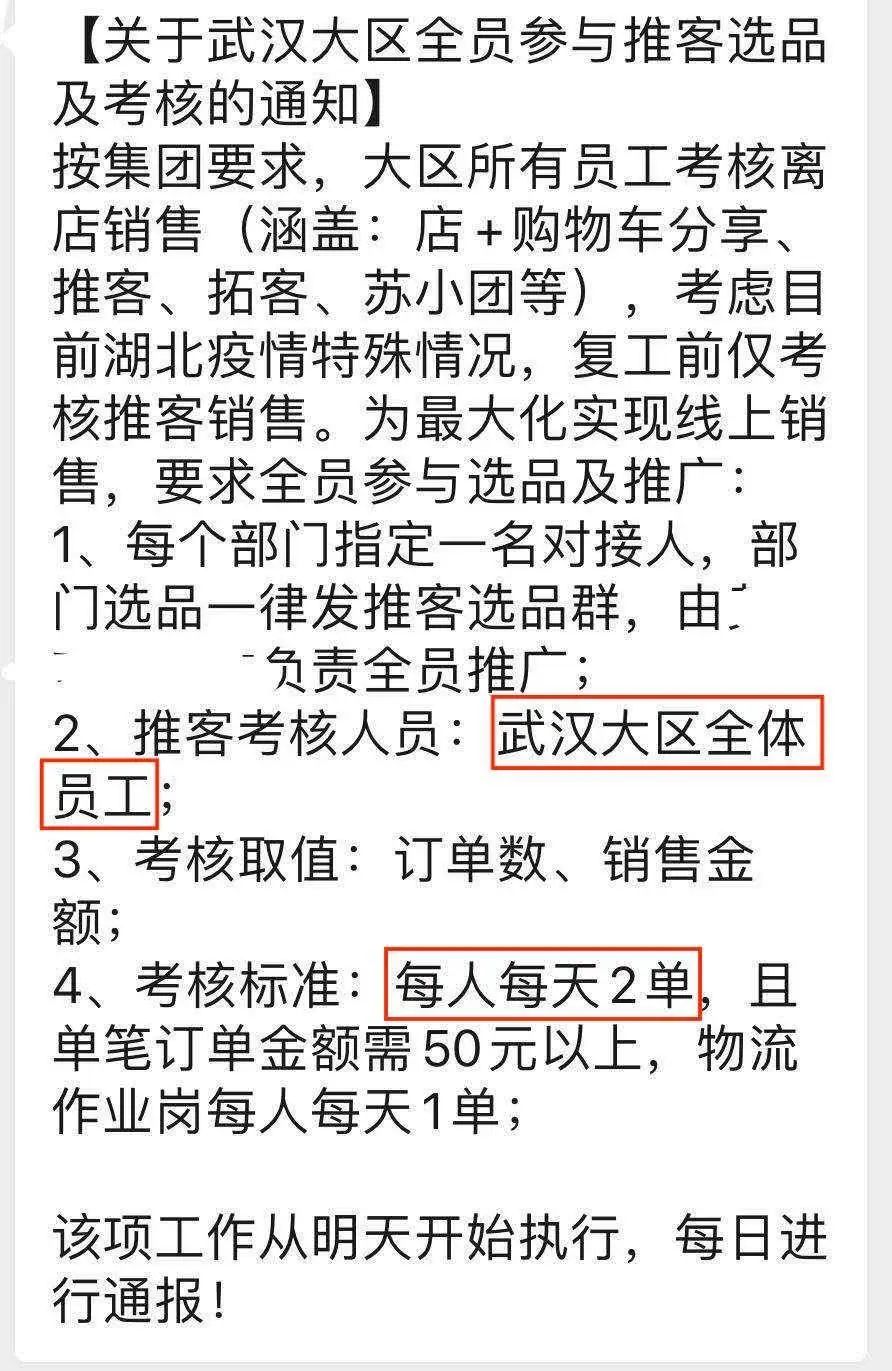 李牧在苏宁武汉大区任职非销售岗位,疫情期间一直在家远程办公。据他回忆,他所在的大区于2月13日第一次发布带单考核方案,要求所有岗位员工每人每天完成2单、单笔订单金额50元以上的推客任务,因为他本人和亲戚朋友身在武汉,电商平台的订单基本是不发货状态,想要完成推客任务很难,他最终靠着让亲朋好友充话费才完成任务。