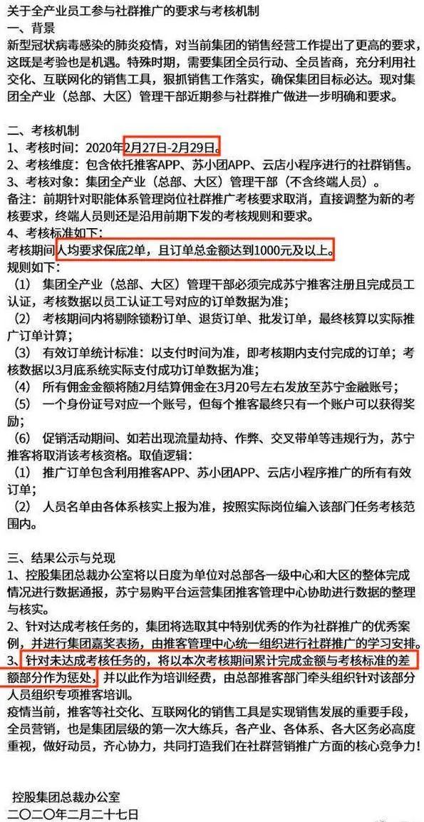 继去年房企争相“全员卖房”之后,今年2月27日,有苏宁员工在社交媒体发布了一份苏宁“控股集团总裁办公室”的公告,公告称苏宁要求全产业每一位员工参与自有APP的线上推广和销售,要求3天内(2月27日-29日)人均完成保底2单,总金额达到1000元以上的销售,未完成的差额将作为处罚,从薪资中扣除。