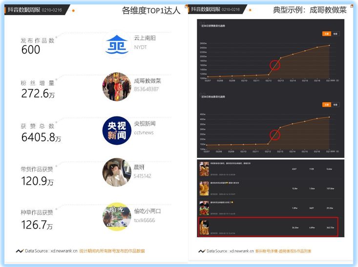 数据显示,2月10日-2月16日这周,一周涨粉TOP5的类别中,美食类遥遥领先,占比高达17%,社会类紧随其后,占比高达14.5%。各维度TOP1达人中美食类达人“成哥教做菜”一周粉丝增量高达272.6万,流量暴涨。