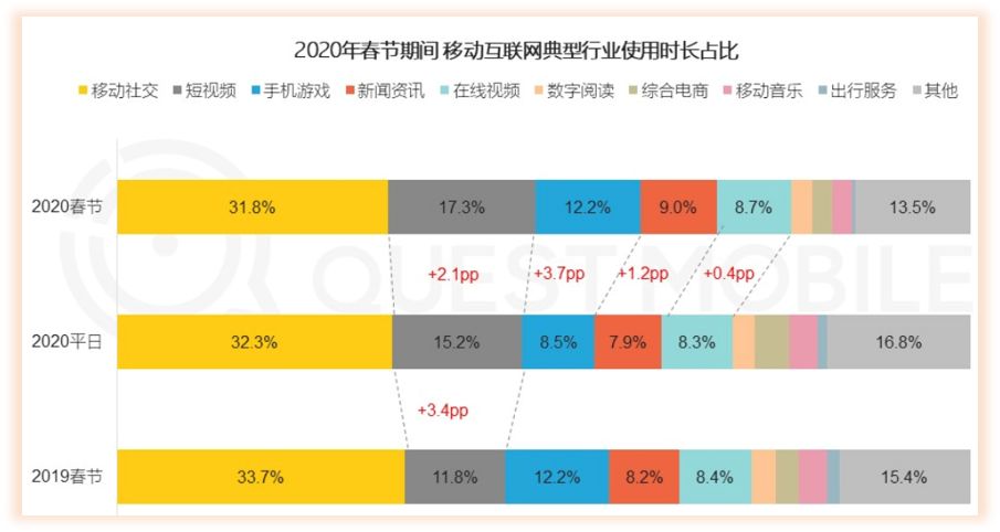 据QuestMobile发布的数据显示,今年春节期间在用户规模增量方面,手机游戏、视频等领域受益明显,其中在线视频、短视频相比节前日活跃用户增量分别达到了16%、14%。