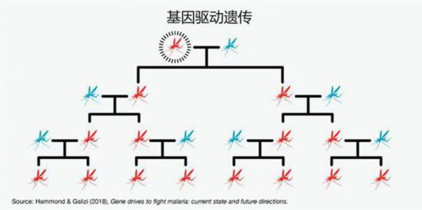 但一个编辑过基因的蚊子,会驱动它所有的后代都携带该基因。也就是说,随着时间的推移,该基因会穿透整个种群。