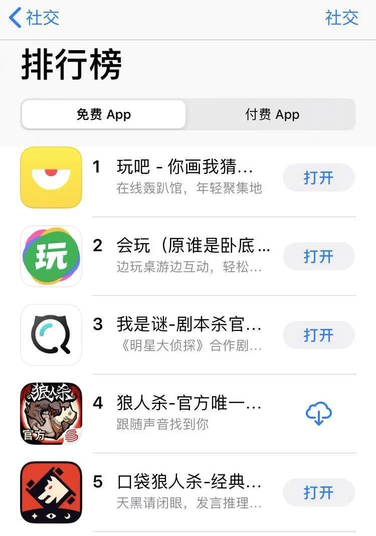 受疫情影响,仍在全员“云办公”的《玩吧》,春节期间App服务器崩溃了两次。这款兼具“谁是卧底”、“你画我猜”、“剧本杀”、“狼人游戏”等各类桌游的娱乐社交App,在1月28日及之后的7天里,始终占据App Store社交免费榜第一的位置。