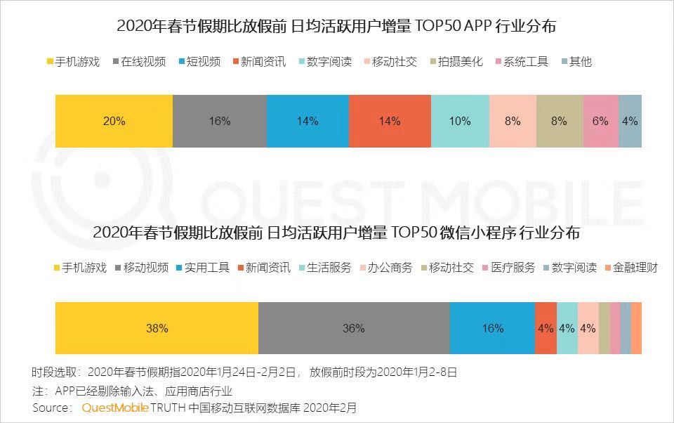 疫情之下,大众自我隔离,游戏成了解救无聊的关键方式之一,无论是游戏类小程序、单机休闲游戏,还是在线终端手游,用户、下载量均暴增。据QuestMobile数据显示,手机游戏成了2020年春节假期日均活跃用户增量最高的行业,高达20%,超过在线视频、短视频等领域。游戏类微信小程序更甚,日活超过平时水平38%。
