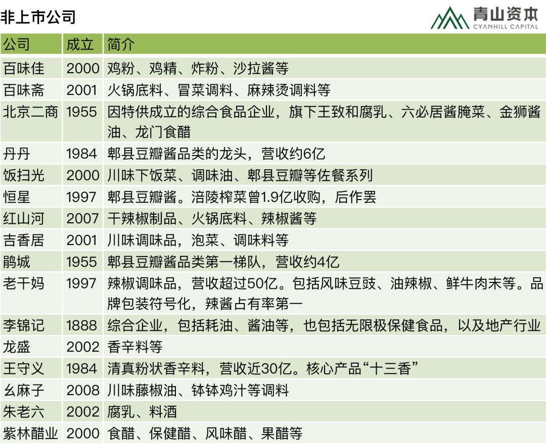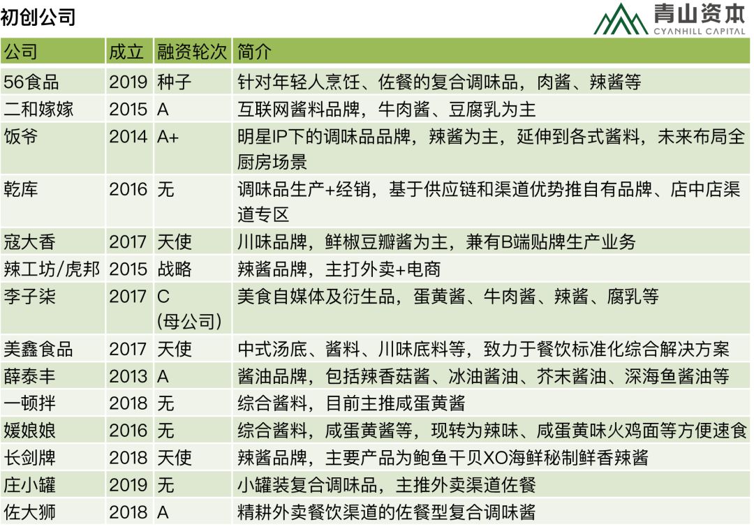 以下是调味品赛道里的不同类型企业图谱,包括有公开信息的初创企业。也希望您来补充,详情见文末互动话题。
