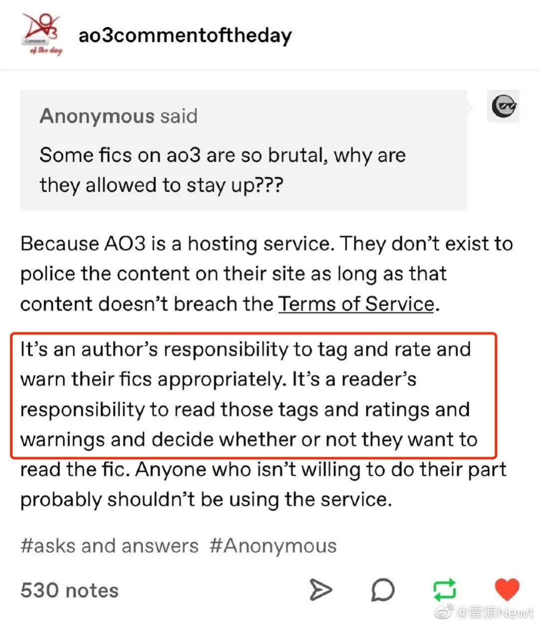 官方明确说明,作者有责任打标签预警,打了标签就意味着“读者后果自负”;而针对“敏感信息、不适合未成年的内容在大众平台传播” 的指责,其问题根本在于读者,而非作者。