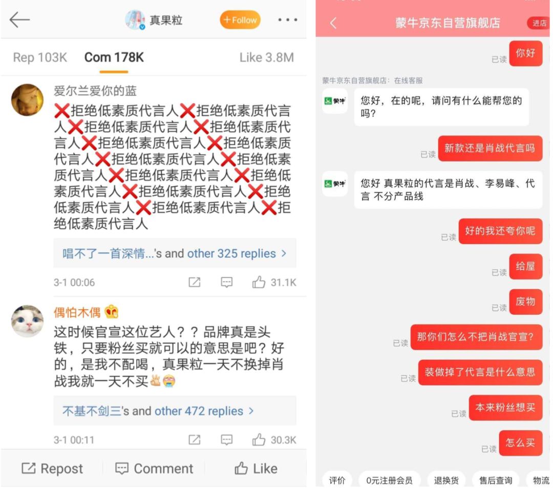 2月29日11点,蒙牛真果粒在微博发布“听说都在等零点”。然而,评论区成为肖战粉丝“期待新口味”和热心网友“抵制代言”的battle现场,原本要在零点发布的消息最终未能官宣。目前蒙牛京东自营店和淘宝蒙牛旗舰店现已搜索不到“肖战”的关联商品。