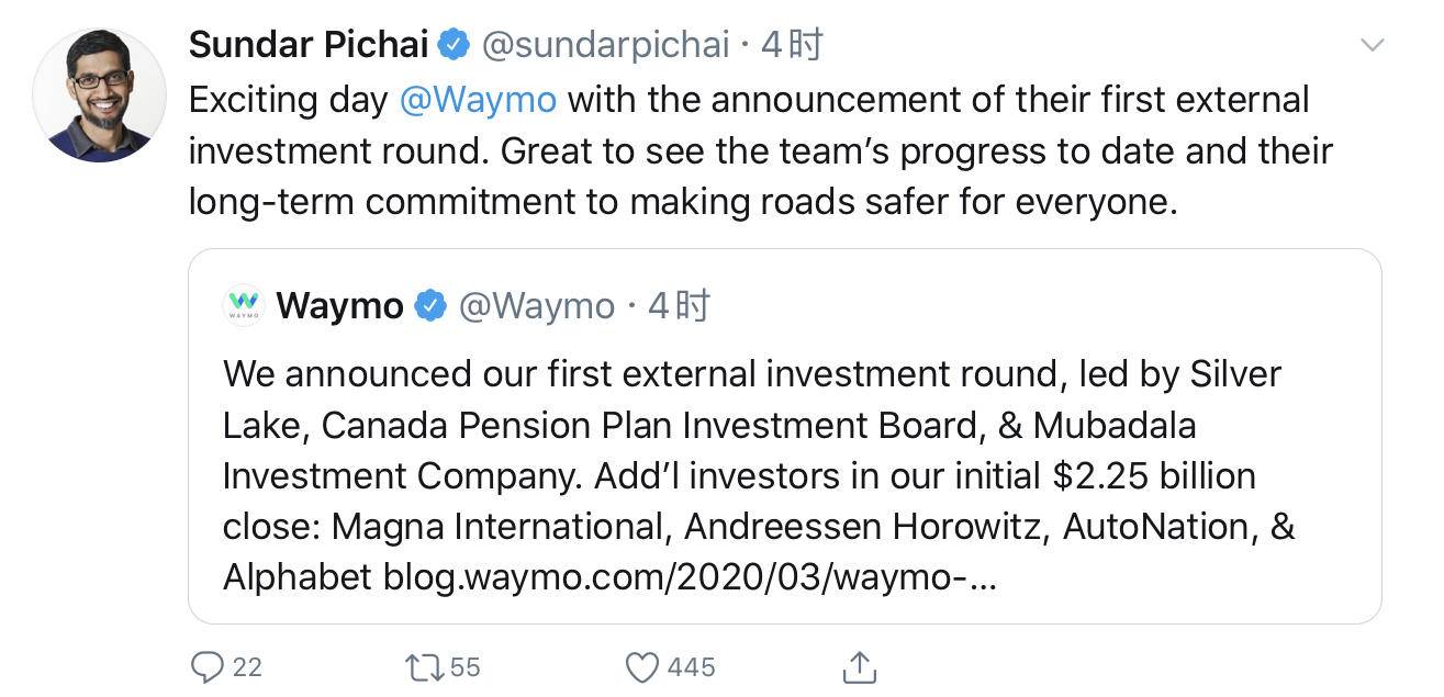 “激动人心的一天。”谷歌母公司Alphabet总裁、CEO桑达尔·皮查伊(Sundar Pichai)在推特上,向谷歌旗下自动驾驶公司Waymo首次获得外部融资表示祝贺。