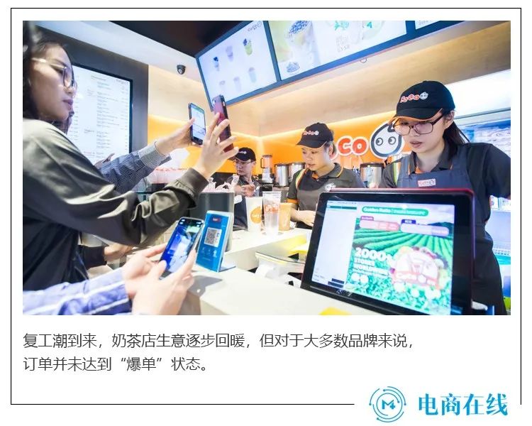 在线下,复工潮的到来,奶茶店生意逐步回暖,但对于大多数品牌来说,订单并未达到“爆单”状态。