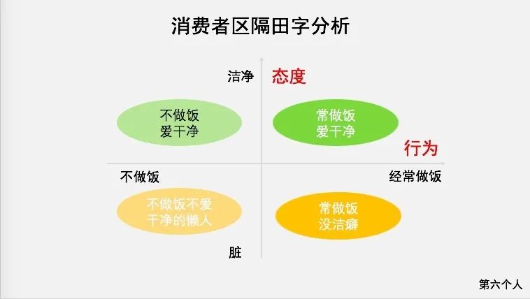 以厨具这个产品为例,如果你想知道你的目标人群究竟是谁,可以用田字分析来进行人群的区隔。具体做法是:按照消费者的行为和态度确定两条坐标轴,即做饭的频率(高或低)与是否在乎厨房洁净(爱干净和能忍受脏)来区分消费者。这就分别形成了四个象限、不同类别的人群:A 常做饭并且很爱干净的人B 很少做饭但却很爱干净的人C 常做饭但是对洁净要求不高的人D 不做饭也不爱干净的懒人