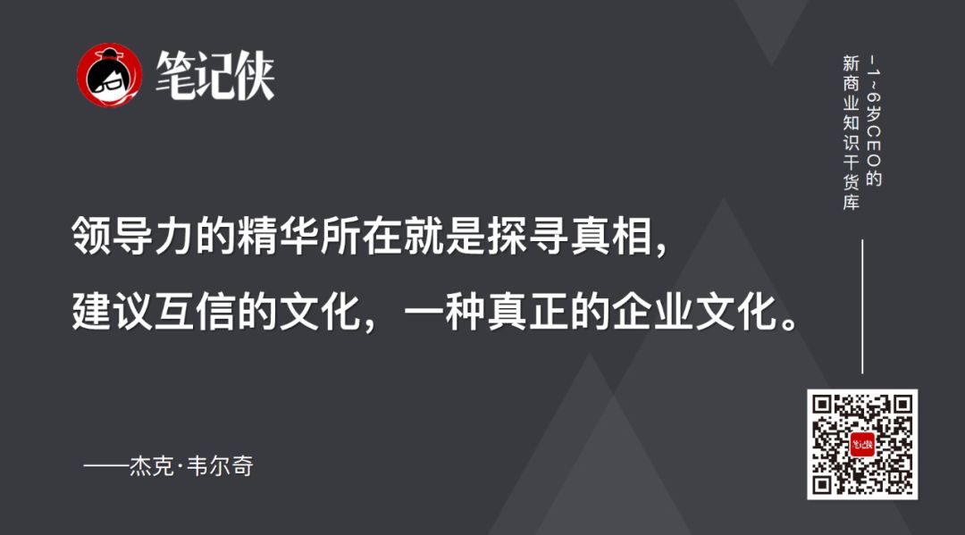 经过75年对成功公司研究,杰克·韦尔奇认为,领导力的精华所在就是探寻真相,建议互信的文化,一种真正的企业文化。