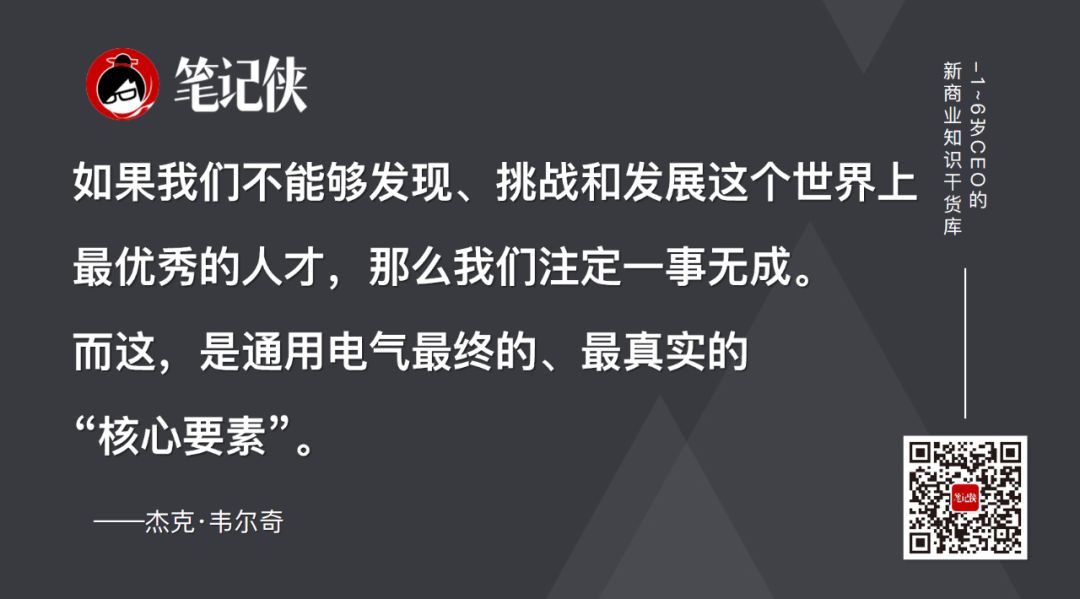 在杰克·韦尔奇的告别演说中,他也提到:“如果我们不能够发现、挑战和发展这个世界上最优秀的人才,那么我们注定一事无成。而这,是通用电气最终的、最真实的‘核心要素’。”