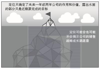 我把定位比作冰山:冰山的最顶端是下一年或两年后公司的地位和关注重点,露在水面上的冰山部分就是近期能拥有的地位。露在水面上的部分就是你所关注的定位,但这并不意味着你放弃了其他方面的内容,只是你现在还没有准备将公司的全部面貌公之于众。