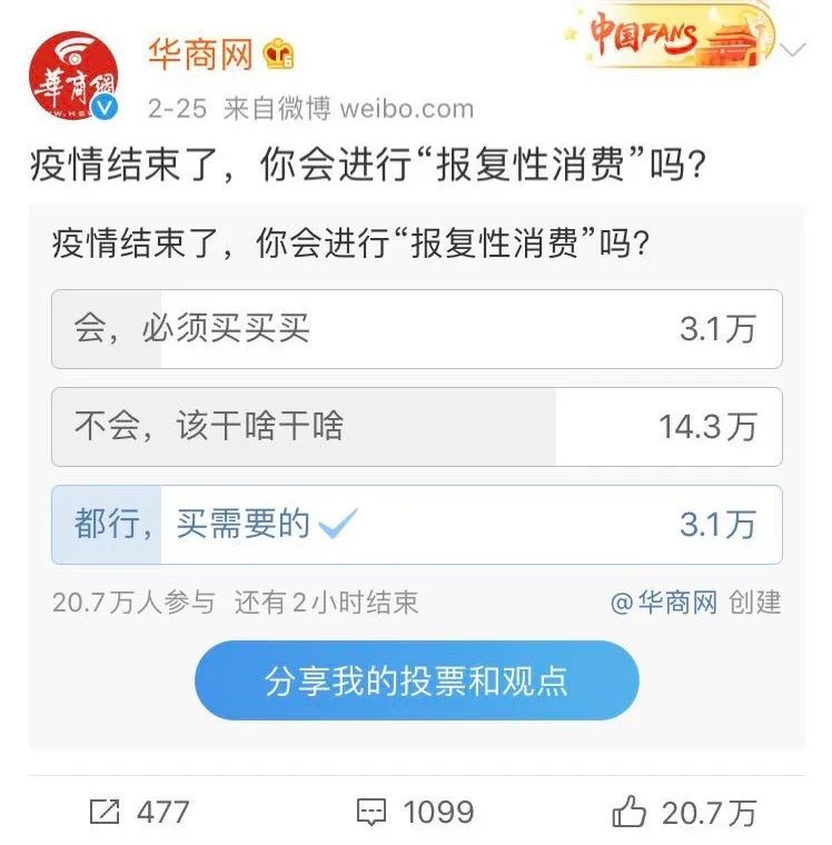 微博前几天有一项投票:疫情结束后,你会进行“报复性消费”吗?