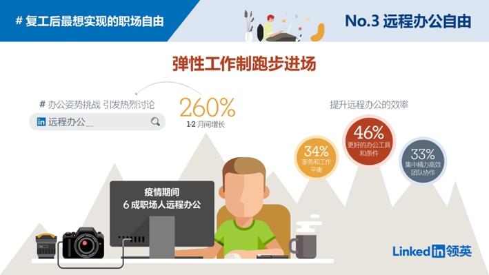 一直以来,中国对于弹性工作制的重视程度在全球范围内尚处于起步阶段,但疫情期间加速了职场人对于弹性工作制的思考和探索。数据显示,疫情期间超过六成职场人有远程办公的经历,领英平台关于“远程办公”的搜索次数在过去2个月间增长了260%,关于#办公姿势挑战 的话题更是引发热烈讨论。打破工作时间和地点的限制,不仅可以更好地实现工作与生活的平衡,同时可以激发和拓展工作更大潜能。