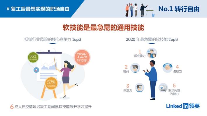 复工后的2020年,行业转型升级的动力会更强,就业市场必将迎来更多的跨界合作。当自动化和人工智能让专业技能可以极大被工具所赋能,软技能作为通用技能将扮演更为重要的桥梁作用,打破行业间的壁垒,实现跨界或转行自由。无论各行各业,在提升专业素养的同时,职场人务必应该重视起对最急需软技能的积累。