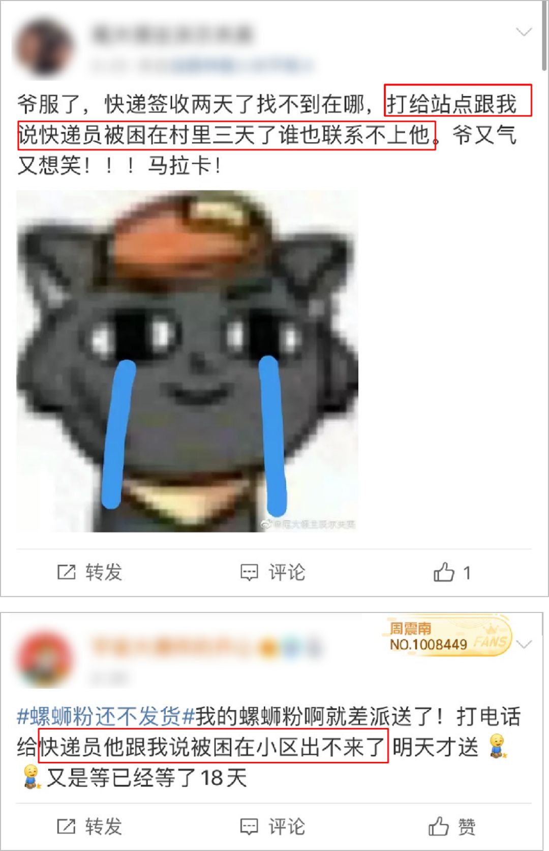 快递小哥们要么被封锁在村里、小区里出不去,要么回程火车站关闭,又或者千辛万苦回来后,被告知需要居家隔离 14 天……