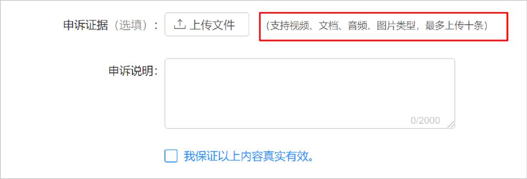 这些信息里面最重要的就是快递单号、邮箱(接收结果)和上传证据,证据支持上传视频、文档、音频、图片,最多可以上传 10 条。