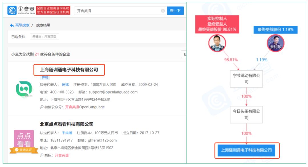 于是开言英语与抖音成了一家人,业务主体也变成了字节跳动旗下的北京点点看看科技有限公司。