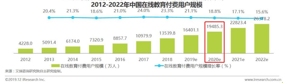 实际上近年来“在线教育”一直很火,互联网的普及和发展使得在线教育用户不断攀升,根据艾瑞咨询数据预测,2020年中国在线教育付费用户规模将达到1.94亿人。
