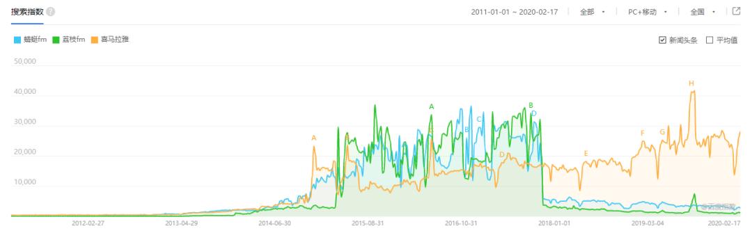 转眼到了2014年,开言英语相继在荔枝FM和喜马拉雅上线音频内容,此时音频平台发展势头迅猛,热度一直持续到了2017年。