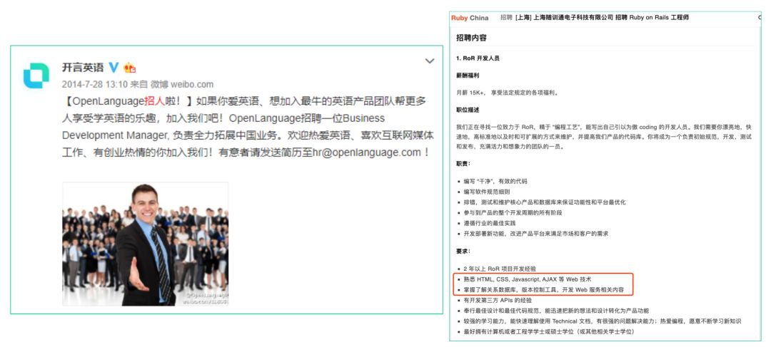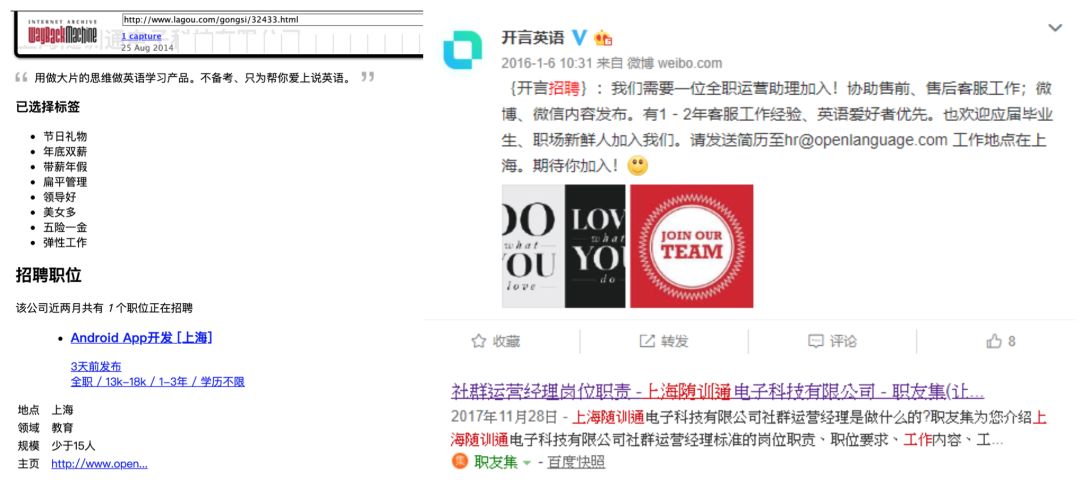 2016年1月,开言英语微博发布招聘全职运营助力,主要负责双微的运营,协助销售工作。