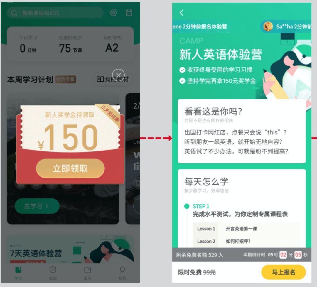 新人完成注册之后会收到一个弹窗提示,“150元奖学金”,三天后就会失效,很好地利用了用户损失厌恶的心理,白送的福利,看看也无妨,点击之后便会跳转到7天体验营的落地页。