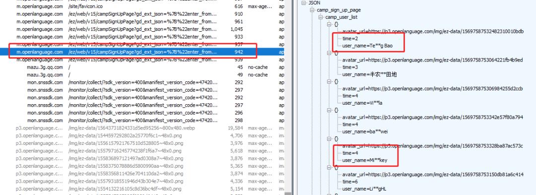 在右侧的JSON代码中,找到了页面上展示的信息,红框中time表示报名时间,user_name为用户名字,组合起来就是“Te**g Bao 2分钟前报名体验营”,与下面截图信息吻合,这个页面应该能找到我们想要的信息。