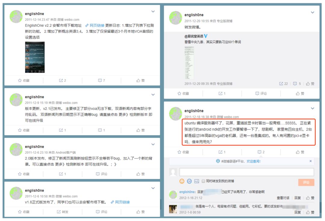 在搜集信息的过程中,我们还发现EnlishOne的微博居然是技术小哥在兼职运营,看看微博的内容,别问,问就是版本更新。