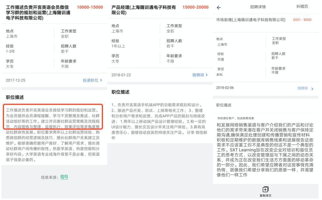 随着知识付费市场的快速发展,2017年运营岗位的分工进一步细化,11月开始招聘微信社群运营,对用户提供重度服务,发力后端付费产品的转化;同时发布的还有产品、市场助理等职位。