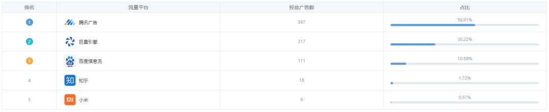 说到这,再给大家深入分析一下开言英语投放的细节。通过下面的截图我们可以看到近180天内,去重累计投放了1049条广告,投放的平台主要有腾讯广告、巨量引擎、百度信息流、知乎和小米,其中腾讯广告独占56.91%。