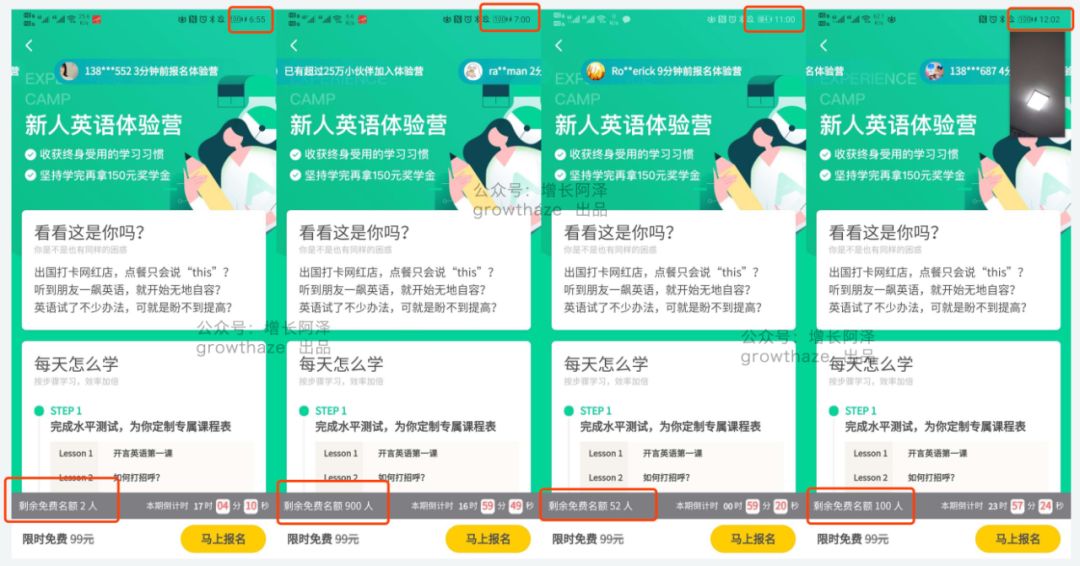 底部则有“原价99元,限时免费”的字样,配合跳动的倒计时秒针,不断减少的剩余名额,各种信息无不刺激着用户快速点下报名按钮。