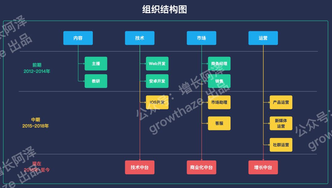 开言英语早期的业务以内容为核心,团队主要由内容(主播)、技术、市场三部分构成,而后逐步扩充完善。