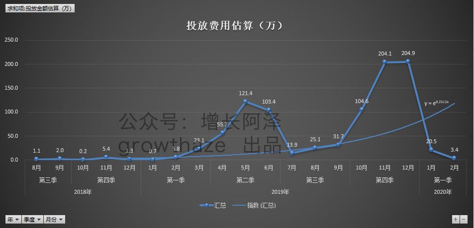 通过对所有投放记录进行透视分析,发现截止2019年2月,开言英语累计投放金额约1千万,投放费用呈现波动上升趋势,由最初的每月1万涨至200多万,与前面提到的用户活跃回暖趋势呈现正相关。