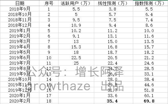 从易观千帆获取到开言英语2019年7月以前的月活数据(主观打开过至少一次APP,即算活跃用户),录入Excel表进行预测分析。