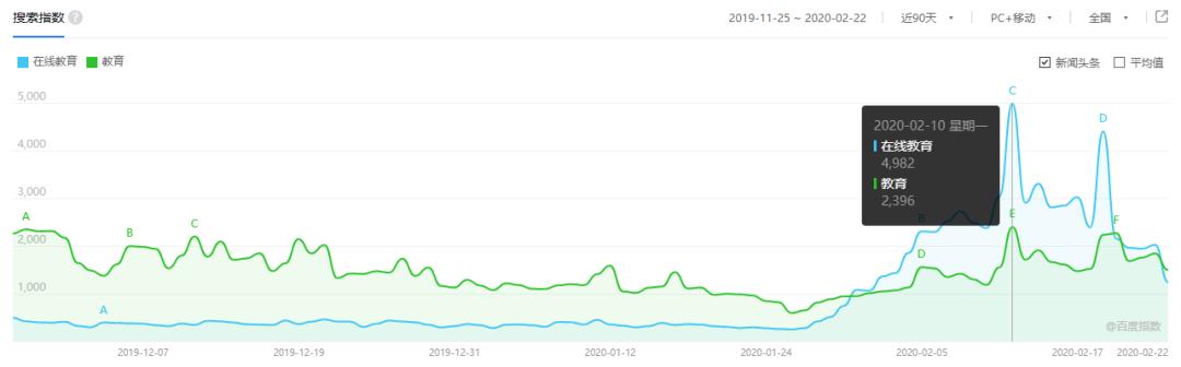 受疫情影响,2020年春季延期开学,线下教育机构纷纷取消课程,众人将目光转向了线上,使得“在线教育”一时间备受关注,关键词的百度指数一度超过了“教育”。