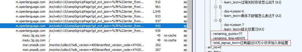 继续下拉,能够看到一个“total_singup_text=已有超过25万小伙伴加入体验营”的字段,这正是顶部轮播的第一段文字,显然这是一段固定的文案。